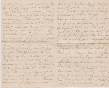 Der er for Resten så yndigt på min Kvist i denne Tid - jeg gør mig en Motion af altid at skruppe og skure og ordne deroppe - så der er skinnende flunkende fint og frisk og duftende; jeg har et dejligt Flor af Blomster i Vinduerne - Be gav mig en pragtfuld rød Pelargonie; som blomstrer ganske overdådigt, en lyserød er også i Flor og et lille Skud - blegrød - har sat en vældig Blomst; Adams Venusbregne er også pludselig begyndt at udvikle sig til en voldsom Skønhed - åh, jeg nyder hver Dag min lille yndige Lejlighed og jeg tror, det er saliggørende for en Dame, der venter sin Nedkomst - at gå så meget alene - for Hjernen er jo nu det ømme Punkt ved sådan en Lejlighed.