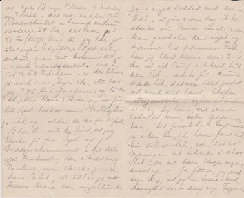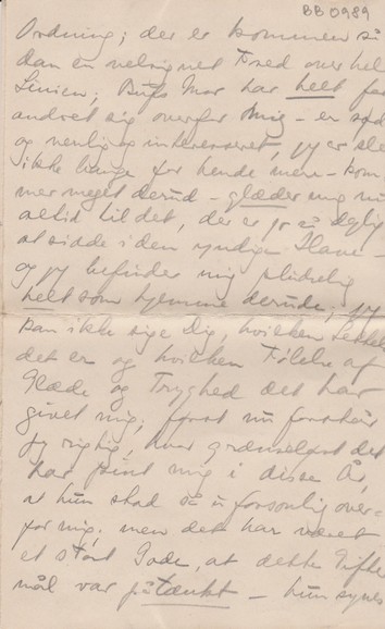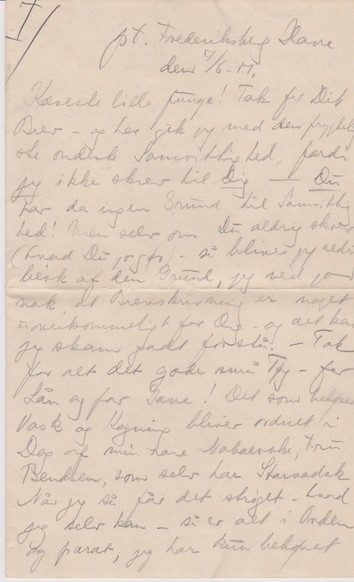 Kæreste lille Junge! Tak for Dit Brev – og her gik jeg med den frygteligste ondeste Samvittighed, fordi jeg ikke skrev til Dig – Du har da ingen Grund til Samvittighed! Men selv om Du aldrig skrev (hvad Du nu gør) – så bliver jeg aldrig besk af den Grund, jeg ved jo nok, at Brevskrivning er noget uoverkommeligt for Dig – og det kan jeg skam godt forstå. – Tak for alt det gode små Tøj – for Lån og for Gave! Det som behøvede Vask og Kogning bliver ordnet i Dag af min kære Naboerske, Fru Bendsen, som selv har Storvadsk. Når jeg saa får det strøget – hvad jeg selv kan, så er alt i Orden og parat, jeg har kun behøvet at købe 12 nye Bleer, 6 Undertøj og 4 Svøb – det var endda på Presentkortet – hvoraf endnu resterer 28 Kr, det var på 50 Kr (Bufs Mor), så jeg har jo slet ingen Udgifter haft selv endnu, men nu kommer det jo i næste Måned – senest – med 138 Kr til Fødehjem – og der bliver jo nok mere, Vogn etc. Nu har jeg 945 Kr i Sparekassen og 15 Kr skylder Karen K mig; og før til Sept. holder mine Indtægter jo ikke op – altså de 100 fra Alfred. Så har Du måske hørt, at jeg tænker på fra Sept. at få Middagsabonnement – til dels på Frokost; har sikret mig Pauline, men skulde gerne have 3 til, så håber jeg at kunne klare den nogenlunde. Jeg er meget lettet ved denne Idè – så går man da ikke straks sin Ruin imøde, men kan forhale den noget og kommer Tid kommer Råd, kan jeg blot klare den 3-4 År, så vil Buf sikkert til den Tid – måske før – kunne træde til ; det ser helt godt ud med alt hans; Chefen – Hogemeister – synes at interessere sig for ham, vil gerne beholde ham, selv uddanne ham til praktisk Ingeniør og siden knytte ham fast til sin Virksomhed, som det er Menigen at udvide i stor Stil – om nu bare Krigen engang holdt op. – Ja, Junge, jeg må sige Dig, at jeg er mere end henrykt over den nye Tingenes Ordning, der er kommen sådan en velsignet Fred over hele Linien; Bufs Mor har helt forandret sig overfor mig, er sød og venlig og interesseret, jeg er slet ikke bange for hende mere - kommer meget derud – glæder mig nu altid til det, det er jo så dejligt at sidde i den yndige Have – og jeg befinder mig pludselig helt som hjemme derude; jeg kan ikke sige Dig, hvilken Lettelse det er og hvilken Følelse af Glæde og Tryghed det har givet mig; først nu forstår jeg rigtig, hvor grænseløst det har pint mig i disse År, at hun stod så uforsonlig overfor mig; men det har været et stort Gode, at dette Giftermål var påtænkt – hun synes