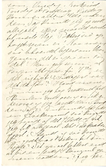 Jeg havde Besvær med at faa en Krave, der passede, de var næsten udsolgte. Denne kostede 1.-35-, jeg tog to Halsstrimler ogsaa, Kan Du ikke bruge dem, kan Du jo faa Penge for dem hos mig, naar vi ses; 40 Øre. – Paa Fredag kommer vist Elle, hun skrev i Gaar, at d:6te skal de have nogle fremmede saa rejser hun med Alhed til Odense Dagen efter, bliver vist hos Syberg til Fredag og saa til Thora. Bare nu Madame vilde staa ved sin Indbydelse, og have Elle den halve Tid, saa hun kunde faa nogle gratis Fornøjelser der; Hun skal være i Kerteminde igen d:24de da Christine giver en Koncert paa Tornøe assisteret af Laust Jensen og Junge 2 Klaverer: Tro mig saa har de travlt med at øve sig. Mon det nu bliver klar med Din Rejse til Kertem. en Gang i April saa Du kan være med d:12? Noget bliver der nu nok, Thora vil da derover. Jeg vil boe i det store Værelse nede i den røde Gaard, saa Du kan boe hos Alhed. Men nu sès Junge en Gang fra første Færge til sidste. Holder Alhed ikke af at see mig der, saa lad mig vide, hvad vi kan, naar hun er i Kbh. I næste Uge er jeg optaget de tre første Dage, Mandag Daisys Fødselsdag, Tirsdag har jeg bedt Anna [ulæseligt ord], Onsdag i Birkerød, Torsdag et Foredrag, Fredag kommer altsaa Elle, men denne Dag kunde jeg jo nok alligevel, ellers maa det vente til næste Uge. Pokkers saa optaget man er! Naa men saa bliver det lysere om Morgenen, det er ogsaa en Fordel! Men jeg ser nu, at Færgen ikke gaar før 7.30, er det rigtigt? Tidligere var det da før? Hvad mener Du om jeg tog Broderiet til Skamlen med over og vi fik en derovre og jeg lavede den i Stand den Dag?? Du kunde ikke lide en S[ulæseligt]skammel, saa kunde jeg bruge af det Klæde af Dit, jeg fik alligevel ikke Pelskaaben gjort i Stand og saa kunde Du godt faa Resten til din Kjole? Det var vel lettere end at føre en færdig Skammel gennem Tolden? Jeg har det nu bedre i Benet, har de tre sidste Dage gaaet en ordentlig Tur, til Langelinie. I Dag skal jeg til Palækoncert, og derfra til Vanløse; jeg ringede derud for at gratulere lille Frits, og Thora sagde jeg maatte endelig komme i Aften. Ellers intet nyt! Kærlige Hilsener til Dig og Børnene.