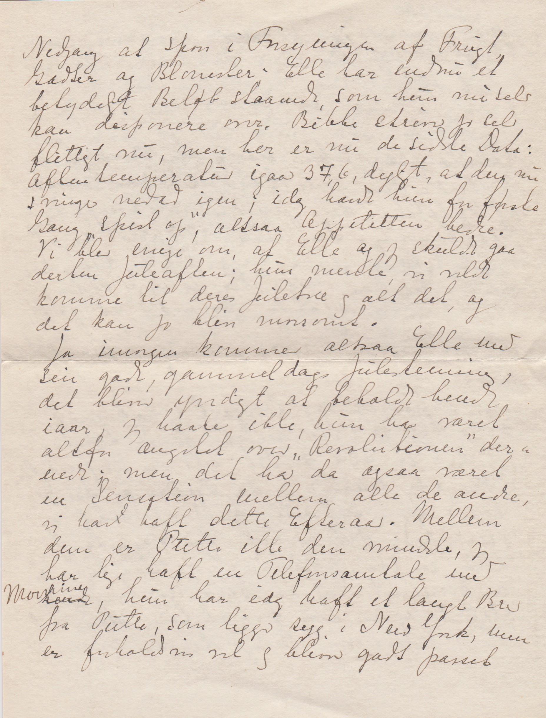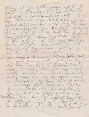 Ja, imorgen kommer altsaa Elle med sin gode, gammeldags Julestemning, det bliver yndigt at beholde hende iaar, jeg haaber ikke, hun har været altfor ængstet over ”Revolutionen” dernede; men det har da ogsaa været en Sensation mellem alle de andre, vi har haft dette Efteraar. Mellem dem er Putte ikke den mindste jeg har lige haft en Telefonsamtale med Mornine som [”Mornine” indsat over linjen; "som" overstreget], hun har idag haft et langt Brev fra Putte, som ligger syg i New York, men er forholdsvis vel og bliver godt passet og tilset af en dansk Læge. Hvad hun ellers skriver om Svend og sit Ægteskab er saa oprørende og modbydeligt, at jeg næsten ikke kan komme mig af det (- men det er da for resten temmelig ligegyldigt.). Du ved maaske, at Mornine har haft Mistanke om, at han ikke er normal; nu har han overfor Putte tilstaaet, at han er et svært Ord, som jeg ikke kan huske. Lægerne havde sagt at han kunde vel med Tiden komme over det, naar hans Kone vilde være taalmodig og hjælpe ham!! Er det ikke forbryderisk ar gifte sig med en ung Pige i den Tilstand og uden at fortælle det til hende og hendes Familie. Alt hvad Putte kan have gjort synes jeg blegner og næsten berettiges, naar man ved det; tænk, at man løber en saadan Risico ved at faa sine Døtre gift Er det ikke haarrejsende?