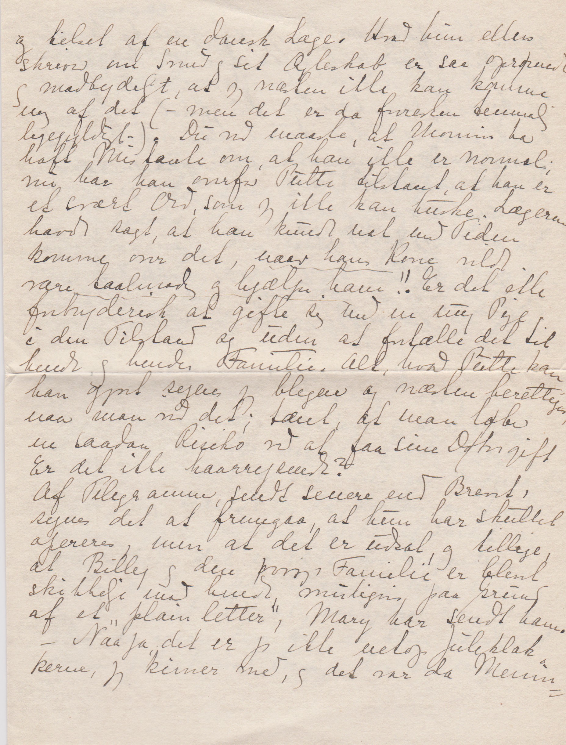 Af Telegrammer, sendt senere end Brevet, synes det at fremgaa, at hun har skullet opereres, men at det er udsat, og tillige, at Billy og den øvrige Familie er blevet skikkelige mod hende muligvis paa Grund et ”plain letter”, Mary har sendt ham – Naa ja, det er jo ikke netop Juleklokkerne, jeg kimer med, og det var da Meningen. Ialfald ønsker jeg af ganske Hjerte, at Du trods alt maa faa en hyggelig Jul, Bibbe vil Du jo savne, men kender jeg Dig ret, saa tænker Du først og fremmest paa, at det kunde have været meget værre. – Du tænker vel ikke paa et lille Nytaarsvisit herind?