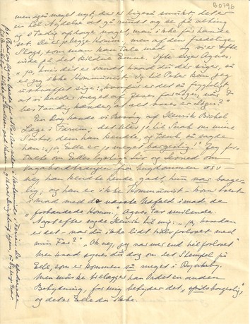 Tak for dit sidste, goe Brev – bare du ikke har gået og ventet på Brev, da jeg skrev til Elles Fødselsdag, bad jeg hende ringe og fortælle dig, at jeg [et overstreget bogstav] rejste her op og at jeg skrev, når jeg kunde men som så kom jeg i Tanker om jeres uhørlige Telefon – og at Klokken el. Flytningen [”el. Flytningen” indsat over liljen] måske ikke endnu er installeret og så kan du jo ikke vide, hvorfor du intet hører - for hjemme har jeg da i Nødsfald Skrivemaskinen – men her er jeg altså, og som du ser kan jeg nu helt godt styre Pennen igen, selv om jeg er langtfra min tidligere Hastighed. - Jeg har nu lige læst dit Brev (som jeg fik 2’ Marts). Harriets lille Pige er en Dreng, det har ikke været mig muligt at få at vide, hvor hun er, men hun har da Drengen hos sig, og så må hun vel søge Stilling igen, hun var vist en Slags Sekretær på Kommunehospitalet, det var vel dér, hun traf Bæstet – nå ja – det er jo en Sygdom at være Psykopat – og de siger forresten, at han er en meget lystig – Psykiater +) (”+)” indsat over linien) (som det jo nu hedder) – og meget elsket af sine Patienter!