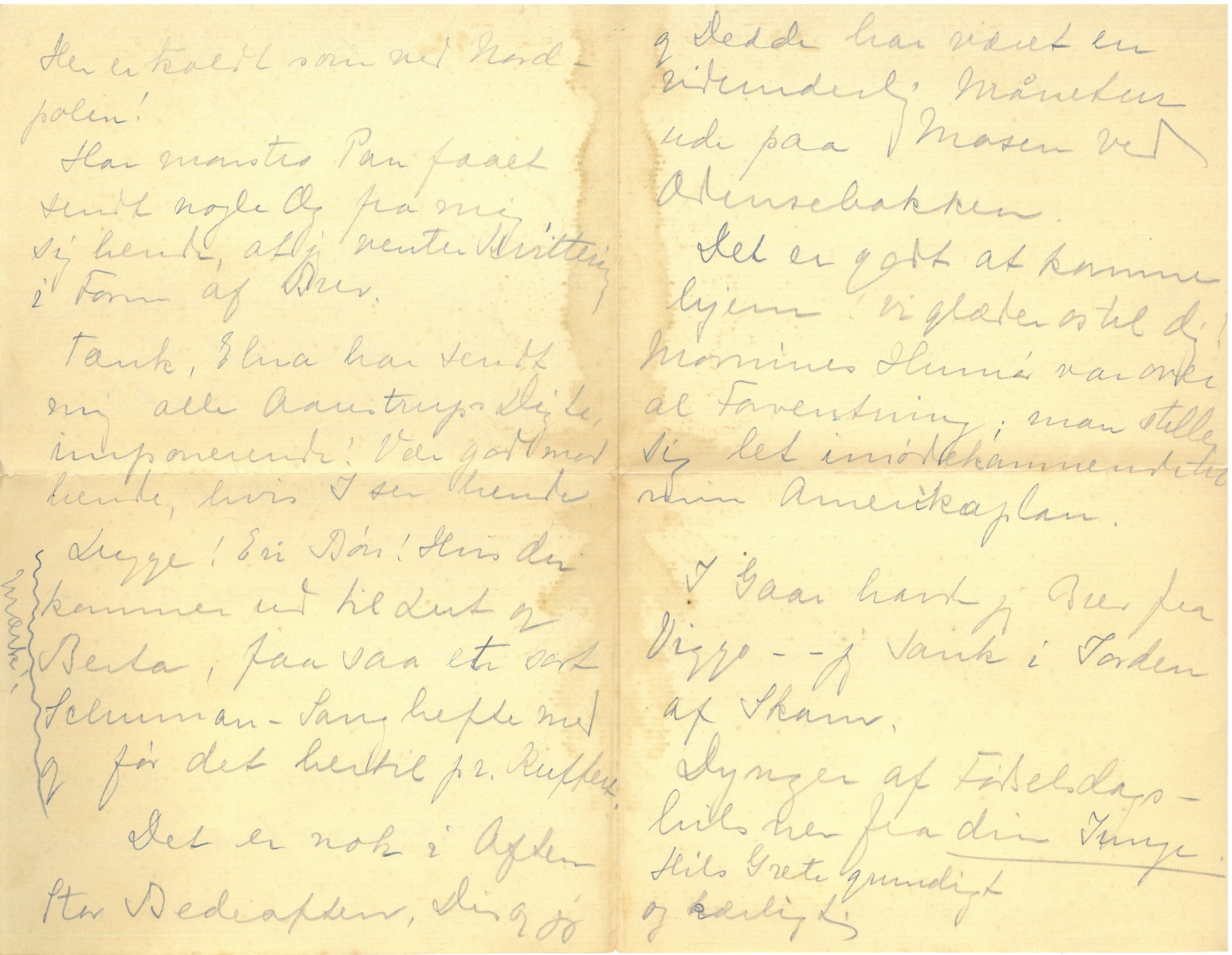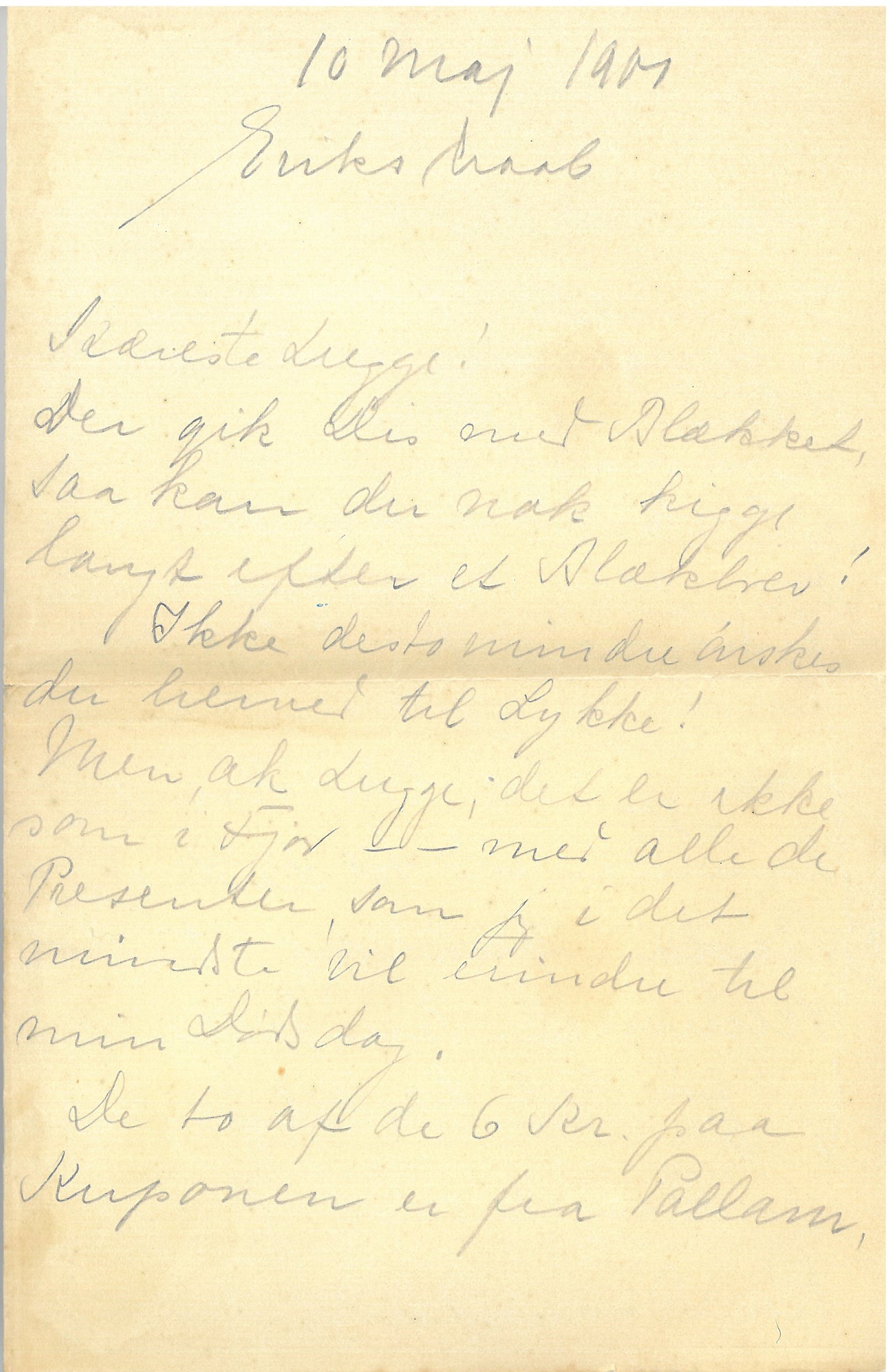 Tænk, Elna har sendt mig alle Aarestrups Digte, imponerende! Vær god mod hende, hvis I ser hende. Lugge! En Bøn! Hvis du kommer ud til Lut og Berta, faa saa et sort Schuman-Sanghefte med og før det hertil pr. Kuffert. [I venstre margen ud for ordene fra "Lugge!" til "Kuffert" er tegnet en bølgelinie, og udfor denne er skrevet:] mærk!
